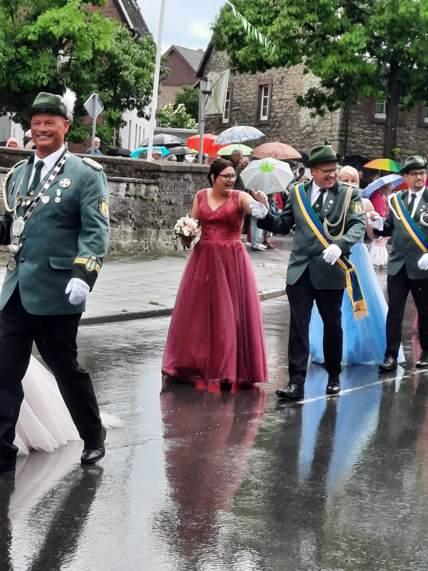 Bei dem anschließenden Festumzug und der Parade im Dorf, sollten wir für die neue Saison direkt neu eingewaschen werden. Doch trotz des Regens, nasser Westen und tropfenden Instrumenten marschierten wir voller Stolz, die Augen rechts, am Vinsebecker Königspaar Ingrid und Markus vorbei. Darauf haben nicht nur wir, sondern auch das Königspaar zwei lange Jahre gewartet.