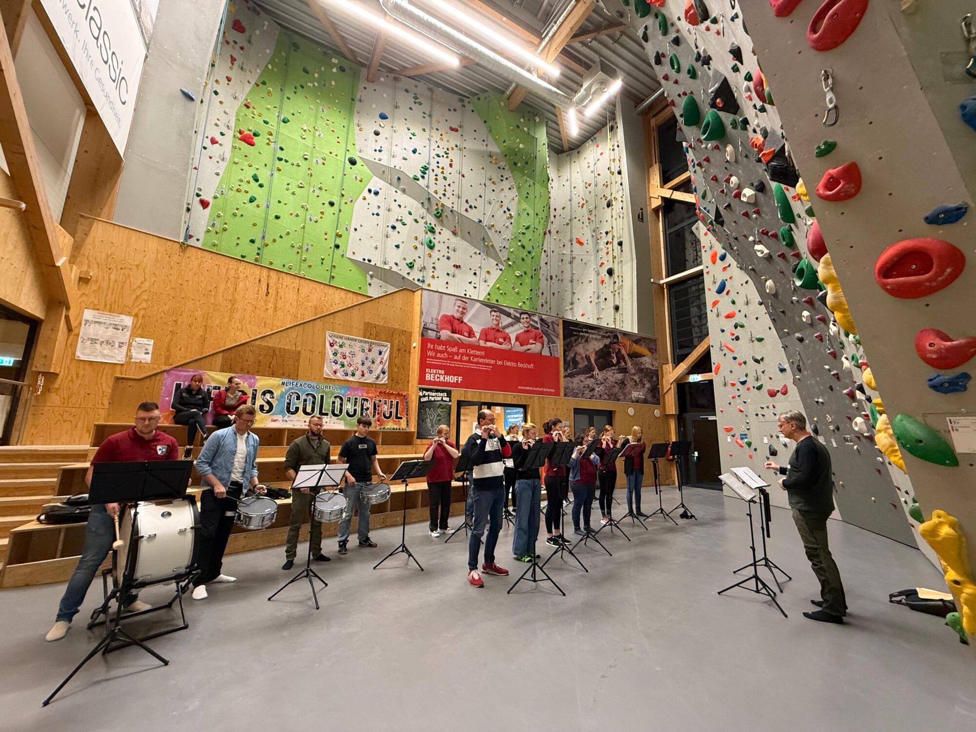 Ein herzliches Dankeschön geht an den DAV für die großartige Zusammenarbeit und die Möglichkeit, in der Kletterhalle zu proben. Neben der Musik kam auch die Bewegung nicht zu kurz: Alle Interessierten konnten bei einem kleinen Schnupperkurs im Klettern und Bouldern selbst aktiv werden – eine Gelegenheit, die viele gerne nutzten.